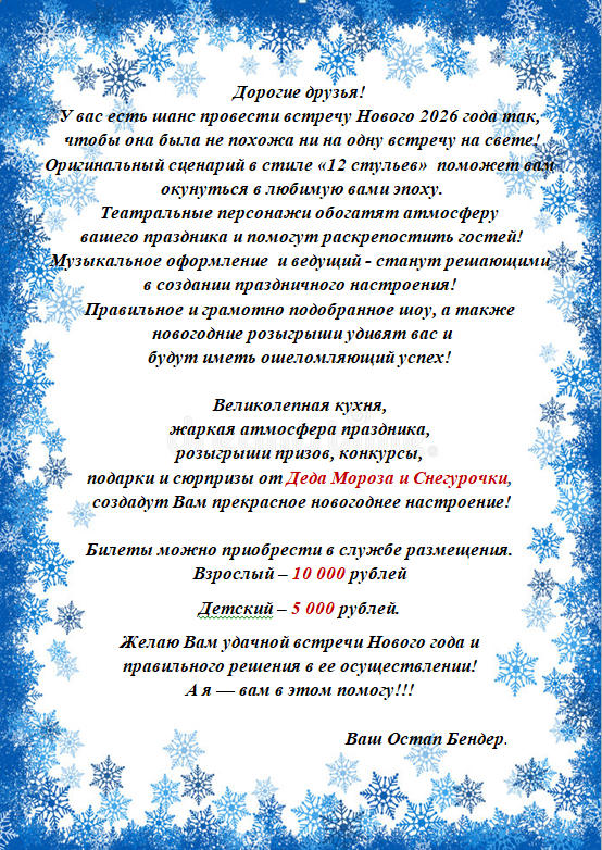 Приглашаем провести новогодние каникулы в Сочи, на берегу Чёрного моря. В санатории «Авангард» для Вас будут предложены оздоровительные процедуры, вкусное меню «шведский стол», увлекательные анимационные программы для детей и весёлый Новогодний банкет с Остапом Бендером.