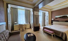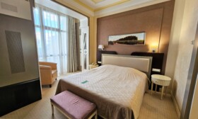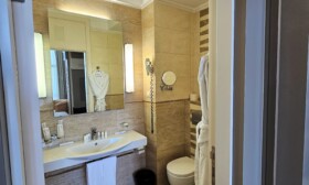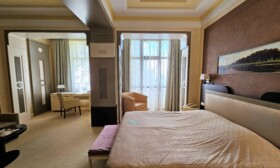 Прекрасный номер с великолепным видом на море. В номере просторная двуспальная кровать, косметический столик и гостевая зона с удобным диваном. В прихожей вместительный шкаф для одежды со встроенным мини-сейфом. Номер оснащен современной мебелью, техникой и доступом в интернет. Санузел оборудован душевой кабиной, современной сантехникой, феном, туалетными принадлежностями.