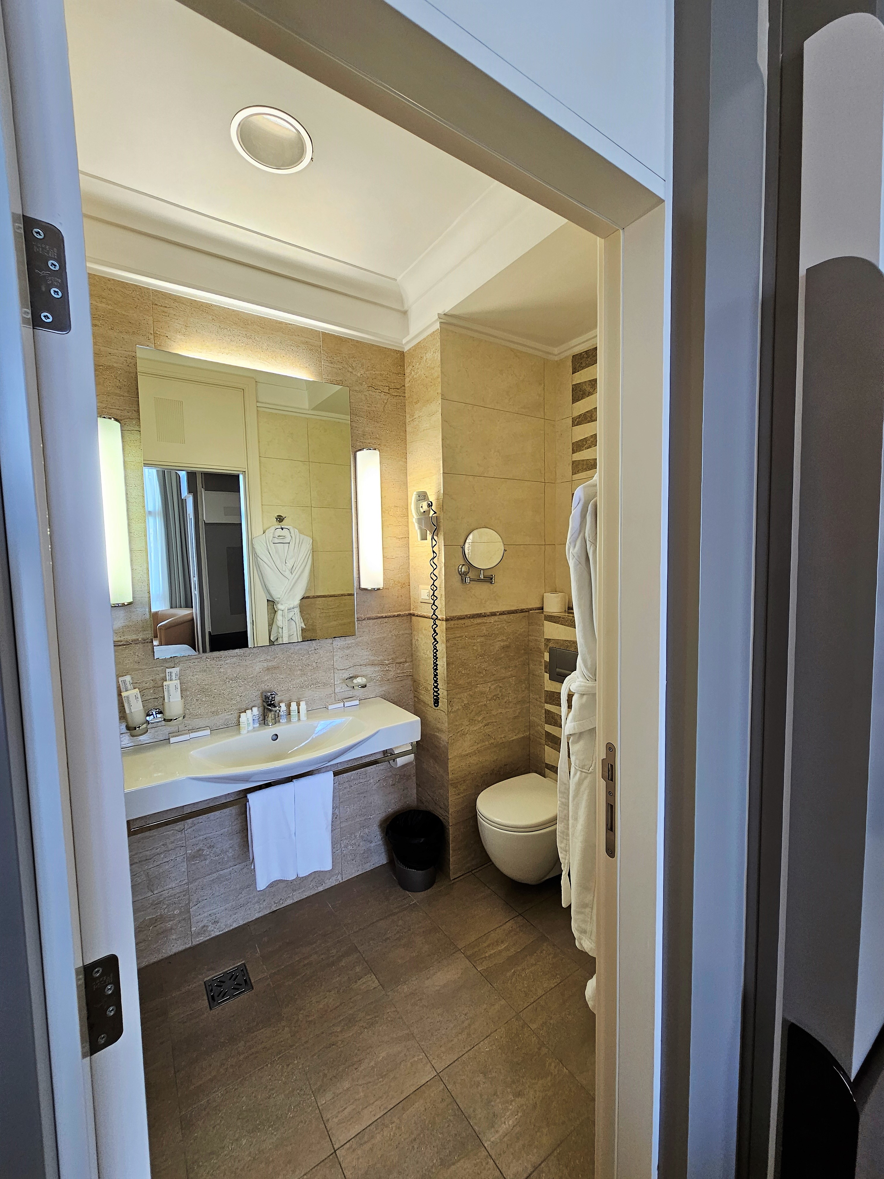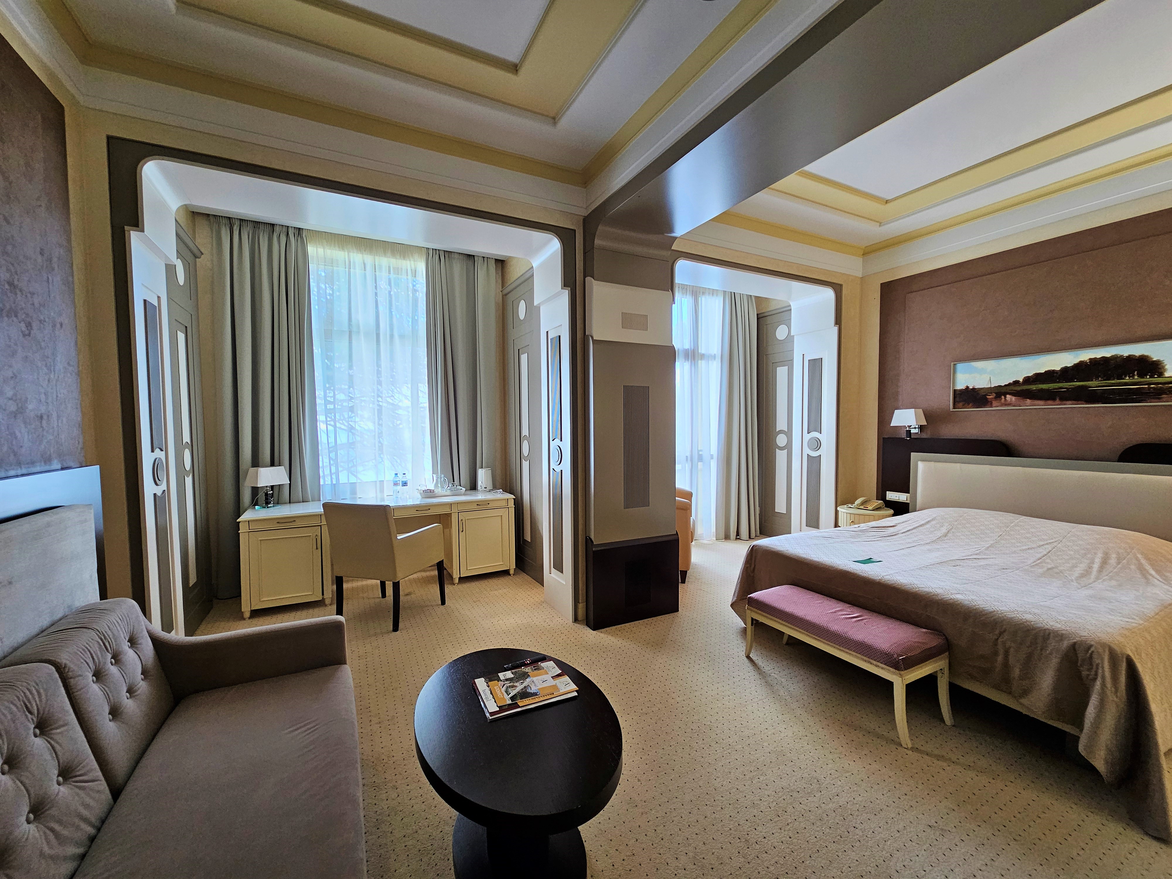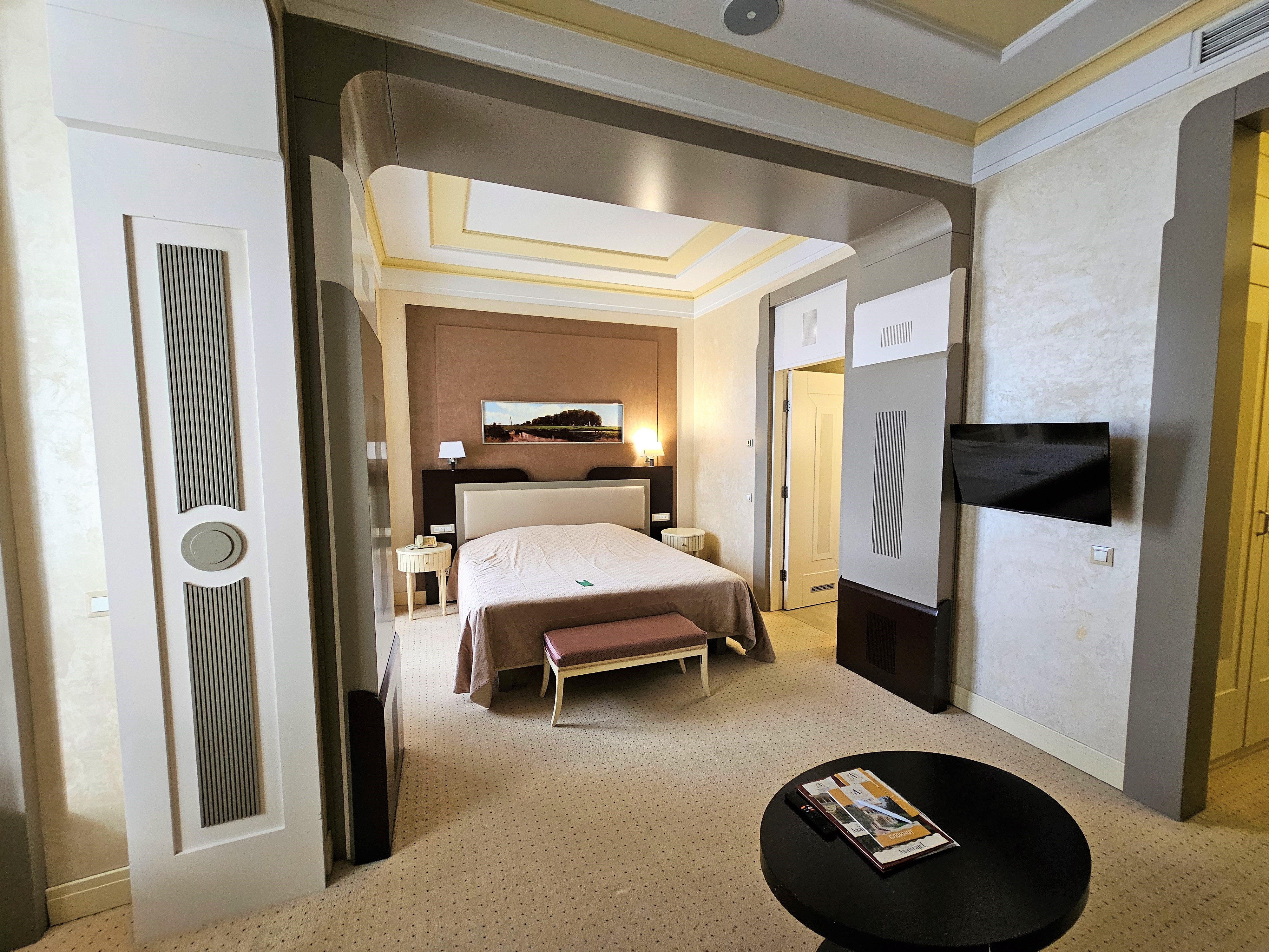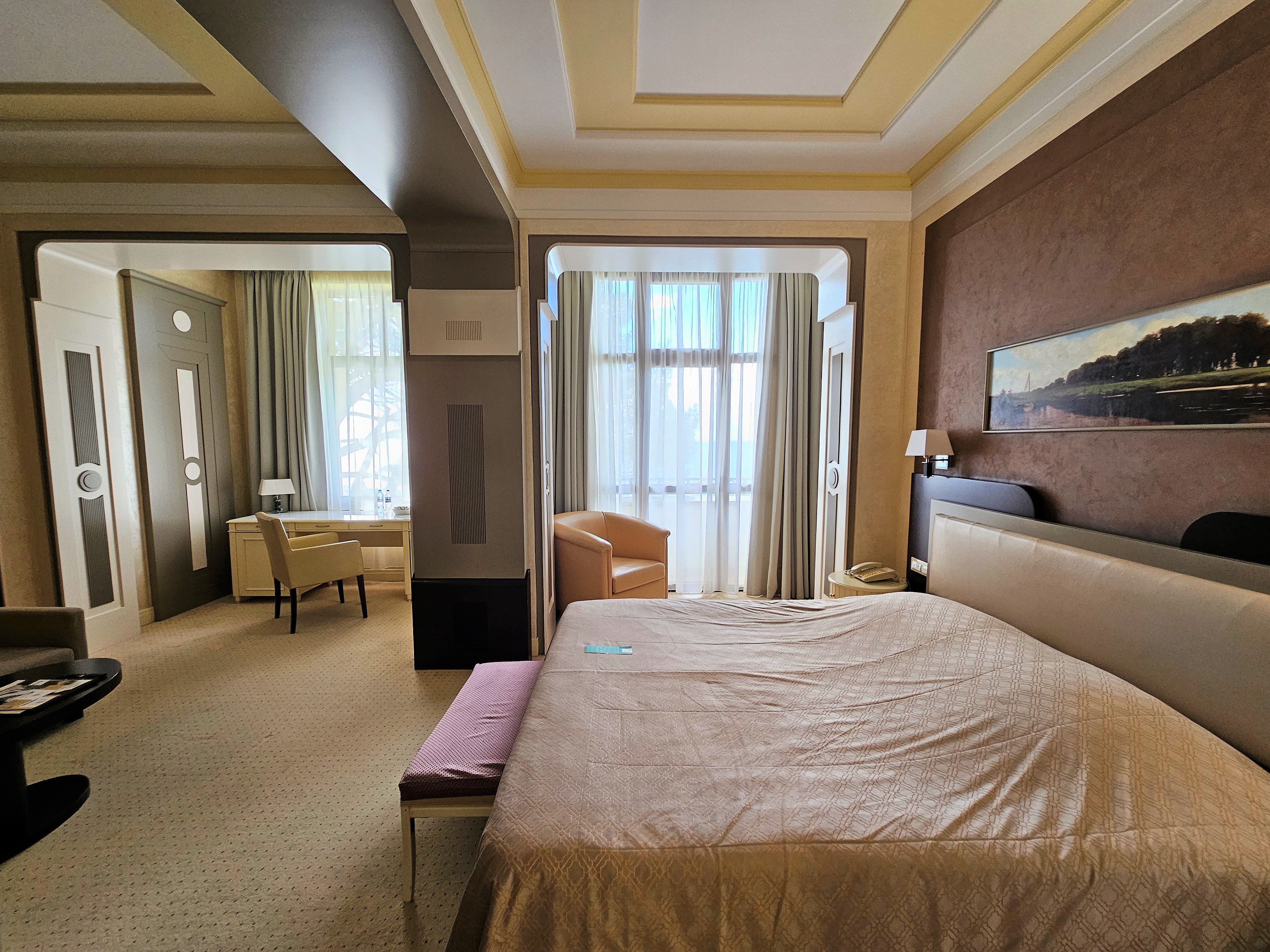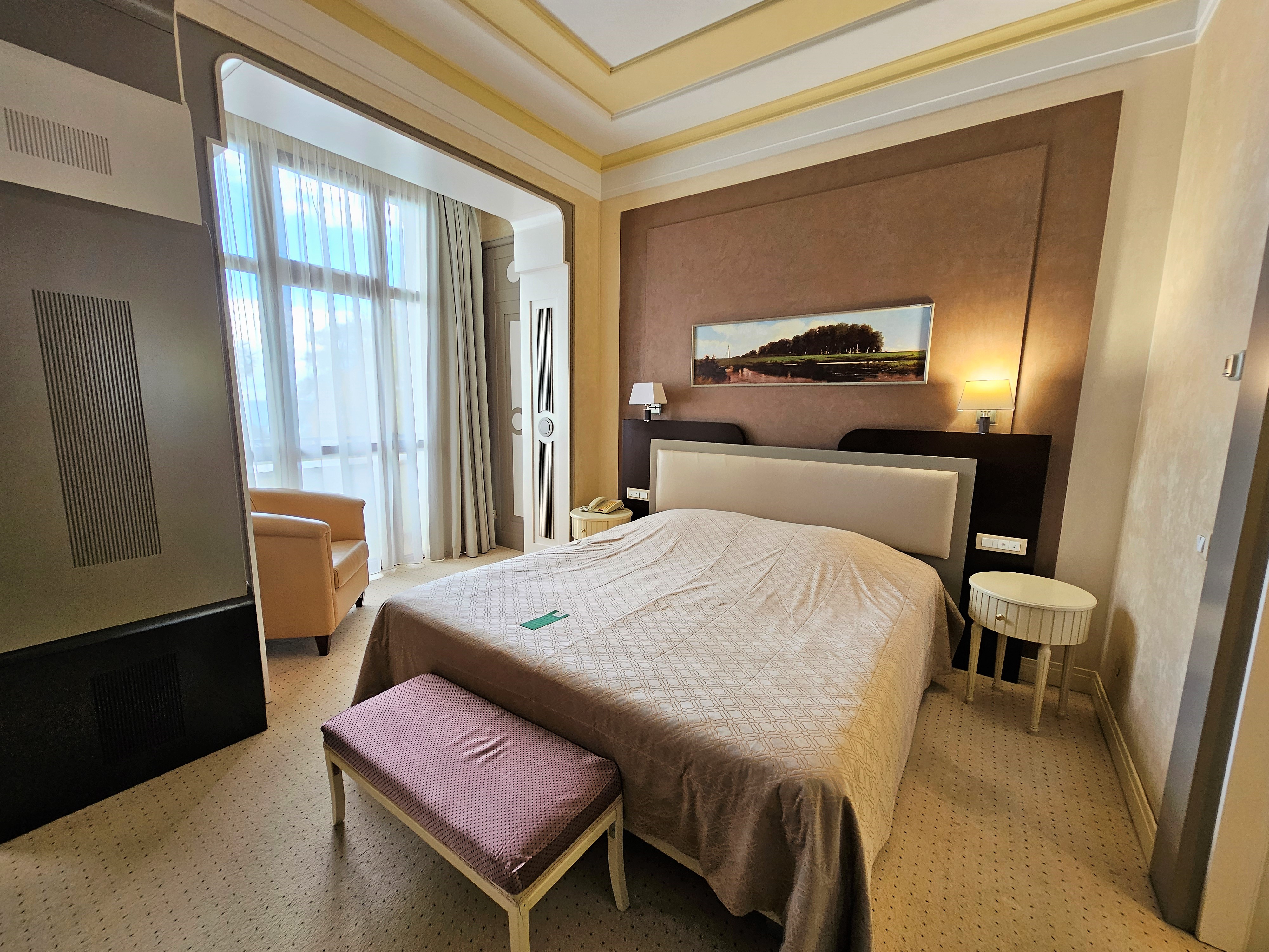 Прекрасный номер с великолепным видом на море. В номере просторная двуспальная кровать, косметический столик и гостевая зона с удобным диваном. В прихожей вместительный шкаф для одежды со встроенным мини-сейфом. Номер оснащен современной мебелью, техникой и доступом в интернет. Санузел оборудован душевой кабиной, современной сантехникой, феном, туалетными принадлежностями.